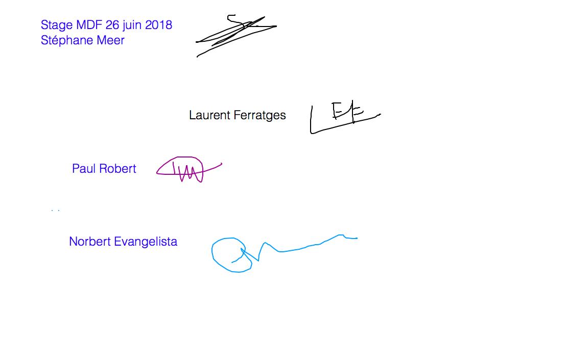 Niveau 1 : Signature des présences sur un tableau blanc partagé. Les stagiaires signent leur feuille d’émargement toutes les demi-journées comme en présentiel. Ils signent avec leur pad, leur souris ou leur palette au début de chaque séance.